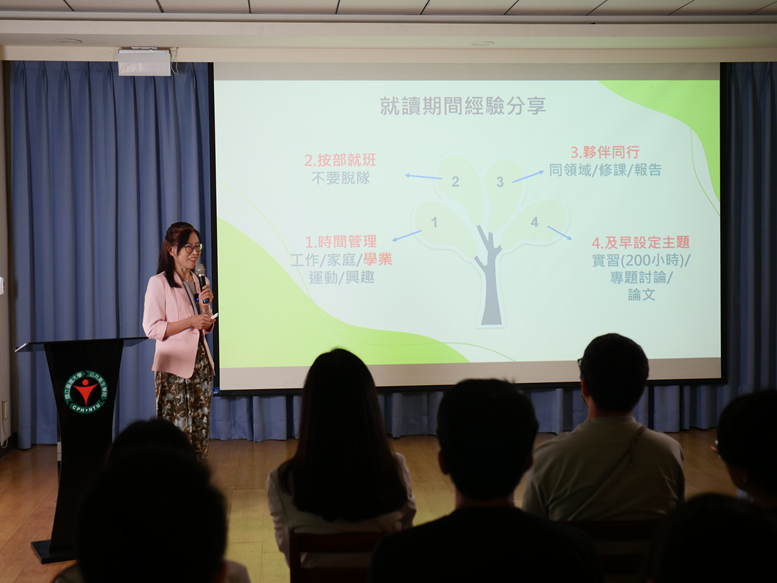 在經驗分享中,她提出四點建議給學弟妹:首先是時間管理,學會在多重角色中分配精力;其次是「按部就班,不要脫隊」,穩定完成課程要求;第三是「夥伴同行」,在同領域中彼此支持、協力完成修課與報告;最後則是「及早設定主題」,提早規劃實習、專題討論與論文方向,才能更有效率地完成學業。